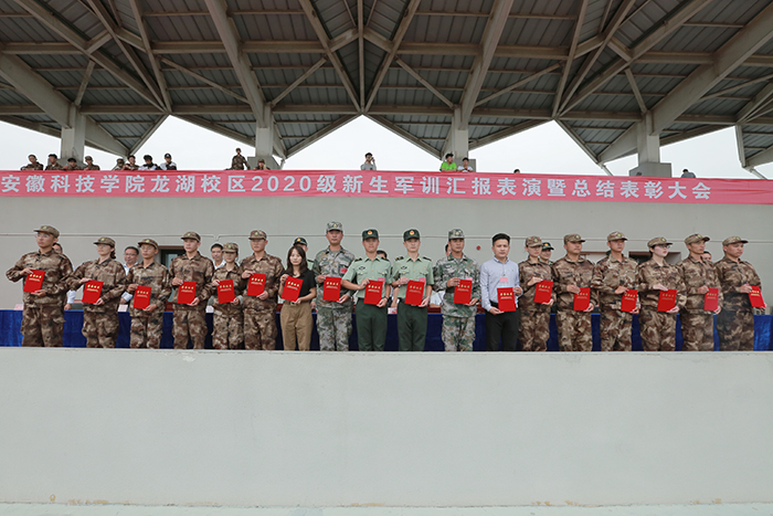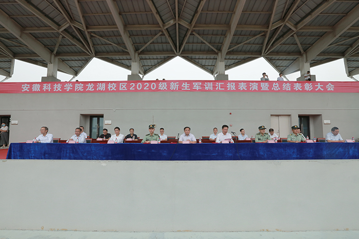 9月29日上午,我校龙湖校区2020级新生军训汇报表演暨总结表彰大会在龙湖校区举行。校党委副书记韦文联,党委委员、副校长黄友锐,陆军装甲兵学院蚌埠校区教练勤务营修理连指导员高亚军,陆军装甲兵学院蚌埠校区战术系教员李为贵,陆军装甲兵学院蚌埠校区教练勤务营二级军士长、龙湖校区军训团团长牟江伟等出席大会并在主席台前排就座。大会由黄友锐主持。
