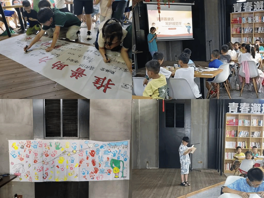 为吸引孩子们积极参与,团队成员郑宇彤、万沐阳用故事引入主题,深入浅出,用丰富幽默、通俗易懂的语言带领孩子们了解普通话对个人发展、国家进步的重大作用,组织孩子们开展自创的游戏“你听我说”体会普通话的实用价值。游戏中,一队用普通话传递固定语句,另外一队用方言,在规定时间内传递正确信息更多的一队获胜。9岁的袁钱子墨说,这个游戏让我体会到了普通话的用处,我以后会督促家里人和我一起说普通话。团队成员宋嘉怡、吴曜亭组织学生开展读书分享会,指导孩子们将自己看到的最精彩的内容读给大家听,用普通话分享自己读书过程中的所思所想所悟,同时互相纠正不标准的发音,孩子们积极参与,场面热闹。团队成员马一荣、朱昆鹏引导学生用图画展现出自己与普通话的故事,带领所有孩子在长长的画卷上留下自己为普通话点赞的手印,教育大家要认真学习普通话,上好每一节课、说清楚每一个汉字。