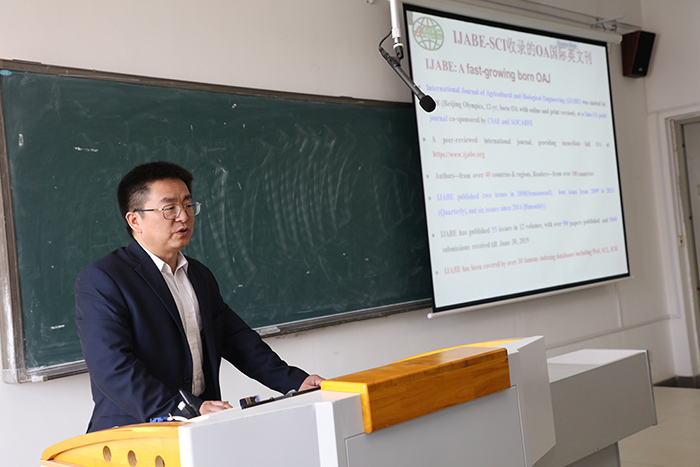 4月9日下午,《天博官方网站_天博(中国)股份有限公司,学报》期刊发展研讨会系列学术报告第六场专题学术报告于凤阳校区新知楼A401举行。《农业工程学报》主编、农业农村部规划设计研究院农业工程科技信息中心主任、《国际农业与生物工程学报(IJABE)》主编、国家精准农业航空中心学术委员王应宽作了题为“如何撰写与发表高质量SCI论文”的学术报告和办刊交流,学院相关专业师生参加了本次学术交流活动。