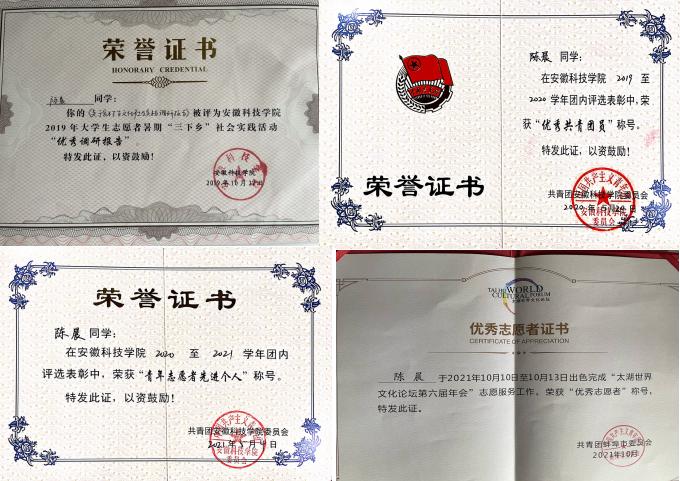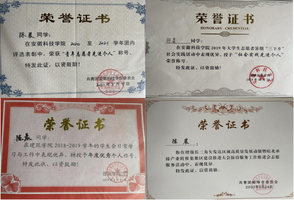作为班级团支书、中共党员的陈晨总是时刻把服务同学、服务班级的使命牢记心间。在学校的各种志愿服务活动中,几乎都能看到陈晨的身影。“作为新时代青年,在兼顾学习的同时应当积极投身于志愿服务,肩负起青年应有的责任与义务。”他说道,“即使这些活动会占用我的闲暇时间,但它仍值得我这么坚持做下去,因为这给我带来了一份宝贵的精神财富。”