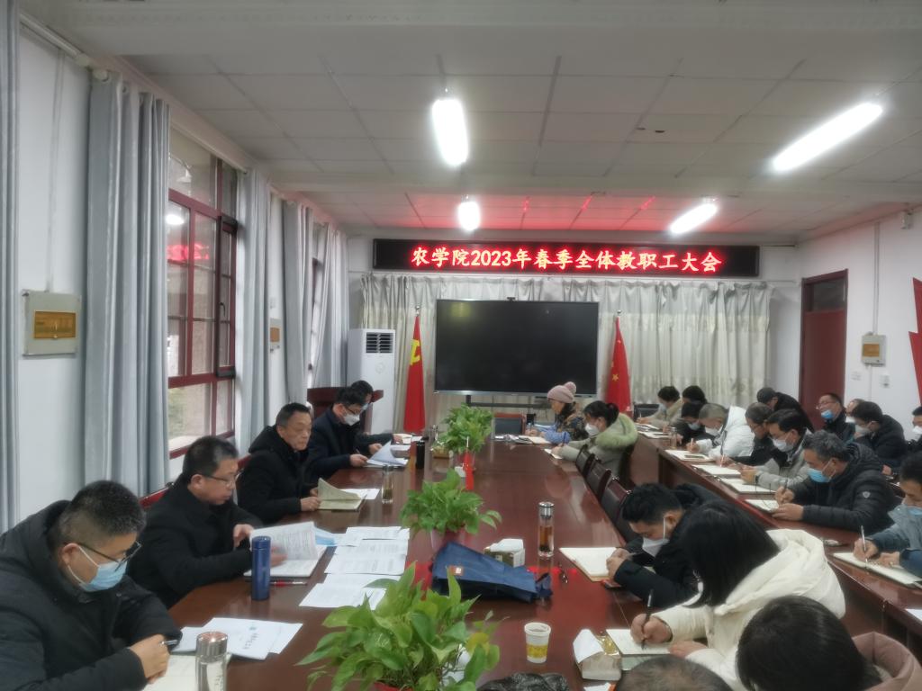 2月23日下午,农学院在学院会议室召开2023年春季全体教职工大会,回顾总结寒假工作情况,部署学期初和2023年重点工作。全体教职工参加会议,农学院党委副书记、院长崔广荣主持会议。