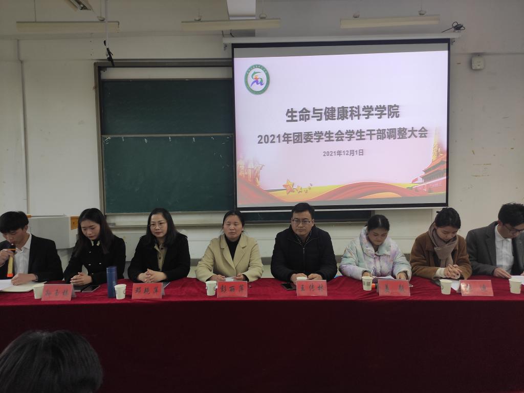 12月1日下午,生命与健康科学学院在新知楼B303教室召开2021年团委学生会学生干部调整大会。学院党委副书记彭丽萍、党政办公室主任王传林、正科级辅导员兼正科级组织员邓艳萍、团委副书记姜毅、专职辅导员孙玉楼及专职辅导员张迪出席会议。上一任学生会部分成员和现任团委学生会全体成员参加会议。会议由姜毅主持。