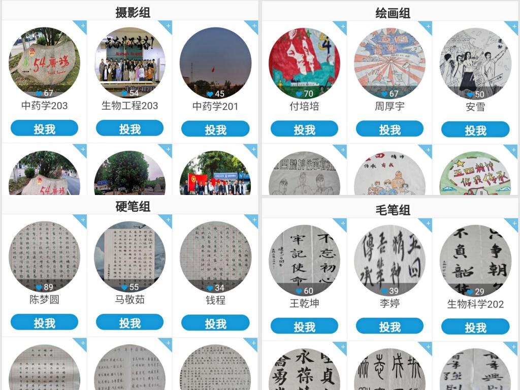 在前期充分的准备工作完成之后,学院召集各班班干征集作品,吸引了许多艺术爱好者的踊跃报名。本次活动采用易班线上投票的方式展开,分为摄影组、绘画组、硬笔组和软笔组四个部分,共收集34幅书画摄影作品。这些作品主题鲜明,内涵丰富。摄影多为校园景色,突出新时代青年昂扬的精神面貌,光影交织、色彩鲜明。书法或工整隽秀、或挥洒自如、或浑然古朴,字里行间浓浓爱国热情;绘画笔墨淋漓、激扬山河,祖国大好河山跃然纸上。作品集思想性、艺术性、观赏性于一体,导向正确,各具特色,具有较高的品位,不乏精品力作。经过最终统分,生物工程203班斩获摄影组第一名,来自中药学201班的付培培荣获绘画组第一名,中药学203班的陈梦圆荣获书法硬笔组第一名,生物工程203班的王乾坤荣获软笔组第一名,其他参赛选手分获二、三名。