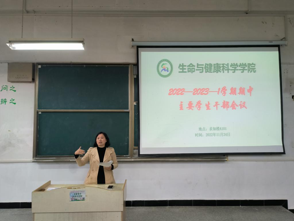 11月24日中午,生命与健康科学学院在求知楼A101教室召开学期中学生干部例会。学院党委副书记、纪委书记彭丽萍和全体专职辅导员出席会议,各班级班长、团支书,学院各学生组织负责人参加会议,会议由副科级辅导员刘国祥主持。