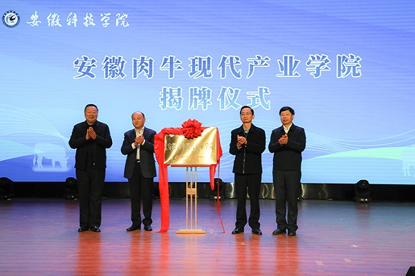 12月10日上午,由我校牵头组建的安徽肉牛现代产业学院成立揭牌暨肉牛产业发展研讨会在凤阳校区隆重举行。省农业农村厅副厅长汤洋、省教育厅二级巡视员郑德新、滁州市人民政府副市长苏虹和我校党委书记时伟共同为“安徽肉牛现代产业学院”揭牌。