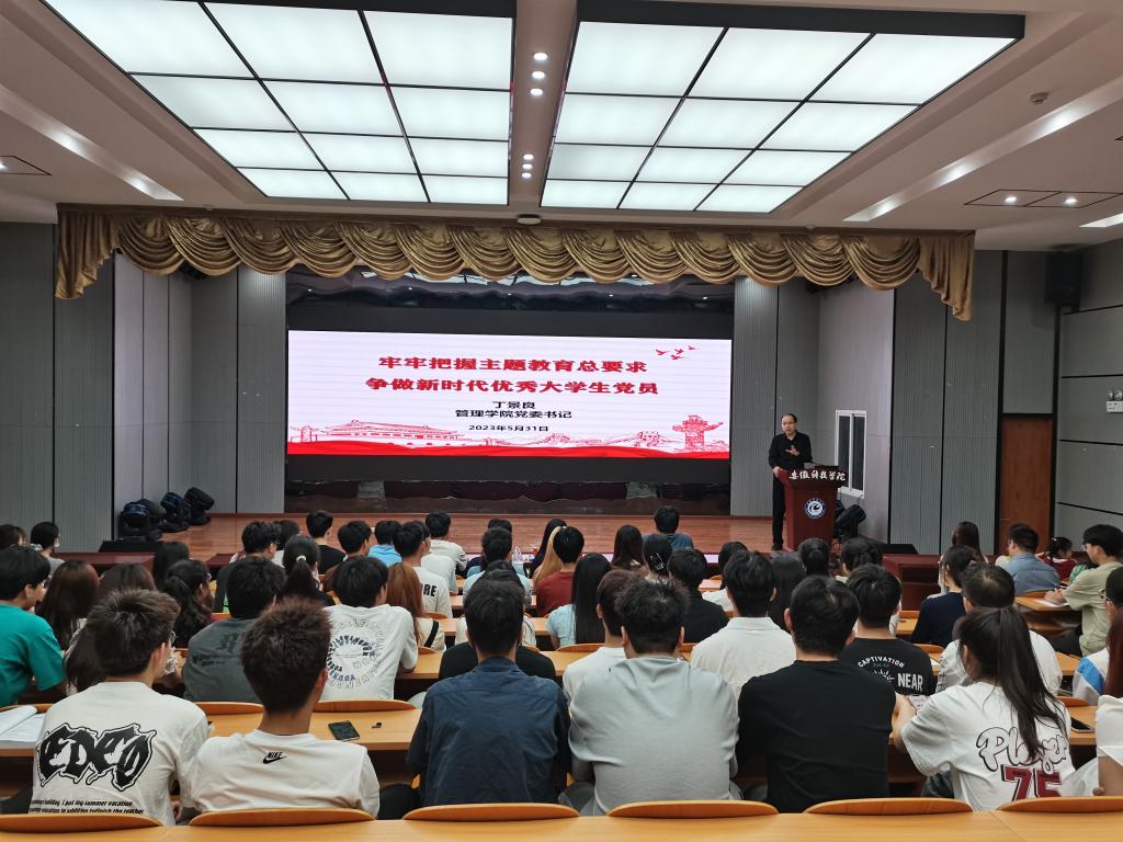 根据学院党委学习贯彻习近平新时代中国特色社会主义思想主题教育总体安排,5月31日晚,管理学院党委在敏行楼A演出厅组织开展“牢牢把握主题教育总要求,争做新时代优秀大学生”专题党课和观看红色影片主题党日活动。专题党课由院党委书记丁景良主讲。全体在校生党员和入党积极分子参加此活动。