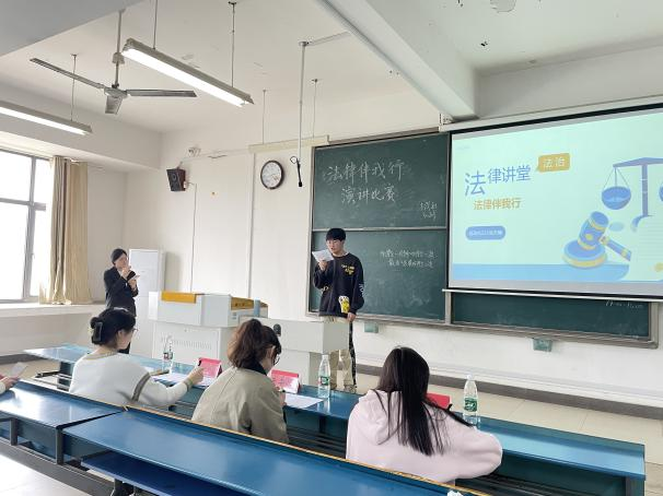 法律和我们每个人的生活息息相关,既是维护自己权利的武器,又是规范自己行为的准则。为向广大师生宣传法律知识,增强同学们的法律意识,近日,人文学院于新知楼A308、A310举办了以“法律伴我行”为主题的演讲比赛。本次活动由法学社承办,由法学社副会张翠翠、王丽娟,菁英主持社副会梅静怡、爱心社会长施翔宇、书美协会副会赵唯一、演讲与口才协会会长朱美怡担任评委。