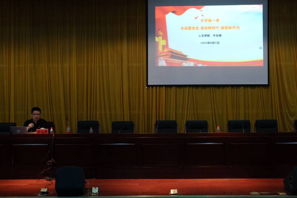 为深入学习贯彻党的二十大精神,推动党的创新理论走进校园、走进课堂、走进学生,引导学生坚定理想信念,争做时代新人,9月14日晚,人文学院在新图书馆二楼报告厅举办“学习党的二十大精神,争做时代新人”开学第一课辅导报告会,报告由党委委员、副院长牛永辉主讲,学院2023级全体同学现场聆听,其他年级同学通过腾讯会议同步线上听取辅导报告会。